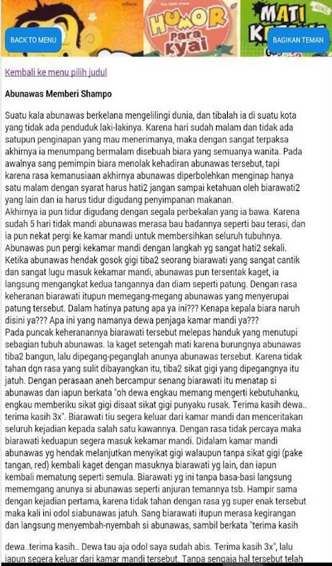 Kumpulan cerita lucu, humor dan tebakan kocak yang bisa menemani kita dikala suntuk dari pada bengong mending baca cerita humor yang bisa memancing tawa. Aplikasi offline ini bisa diunduh gratis disini.