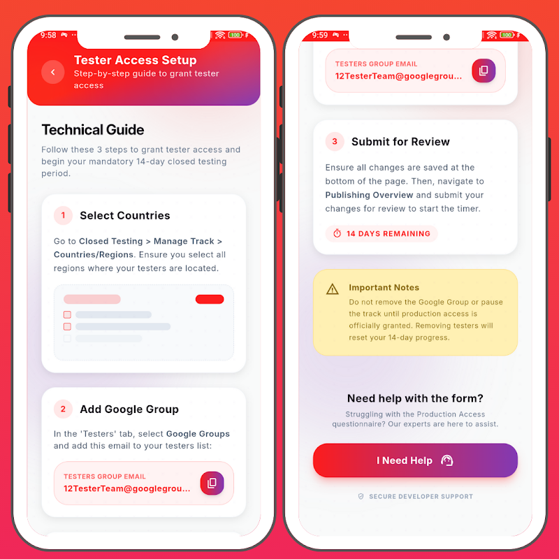 12 Testers – App Testing Pro ไม่รับประกันการอนุมัติ การเข้าถึงการผลิต หรือข้อยกเว้นนโยบาย แอปนี้ไม่ได้หลีกเลี่ยงหรือดัดแปลงระบบของ Google Play กิจกรรมการทดสอบทั้งหมดมีจุดประสงค์เพื่อให้เป็นไปตามแนวทางของ Play Store และ Play Console การตรวจสอบขั้นสุดท้ายและการตัดสินใจเกี่ยวกับการเข้าถึงเวอร์ชันใช้งานจริงนั้นขึ้นอยู่กับ Google Play