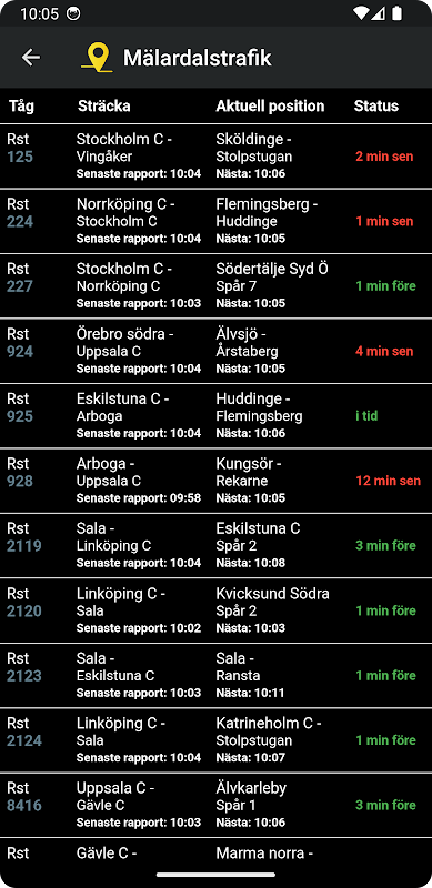 + Pro: Sträckorder + Snabbat upp när man går tillbaka till kartan efter att ha klickat på ett tåg. + Småförbättringar på Tågvy och Tågläge. + Optimerat batteri- och CPU-användning. + Tydliggjort inställda tåg på Station. + Minskat förekomsten av nätverksfel när appen pausas.