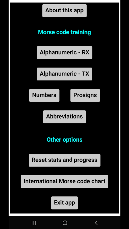 Android เล่นอักขระในรหัสมอร์ส และงานของคุณคือการแตะหรือพิมพ์อักขระที่ตรงกันโดยใช้แป้นพิมพ์เริ่มต้นหรือ QWERTY ของแอป หรือแป้นพิมพ์ภายนอก เมื่อคุณได้เรียนรู้ชุดตัวละครที่มีความสามารถ 90% แล้ว จะมีการแนะนำตัวละครใหม่ เร็วๆ นี้ คุณจะมีตัวละครจำนวนมากที่ Android จะเลือก โดยให้น้ำหนักกับตัวละครที่เรียนรู้ด้วยความสามารถที่ต่ำกว่าและตัวละครที่มีการเปิดรับแสงน้อยที่สุด ก่อนที่จะสุ่มเลือกจากกลุ่ม
