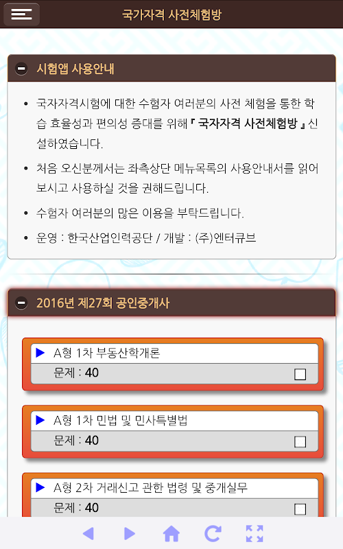 - 2017년 현재 공인중개사, 주택관리사, 물류관리사, 경비지도사를 체험하실 수 있습니다.