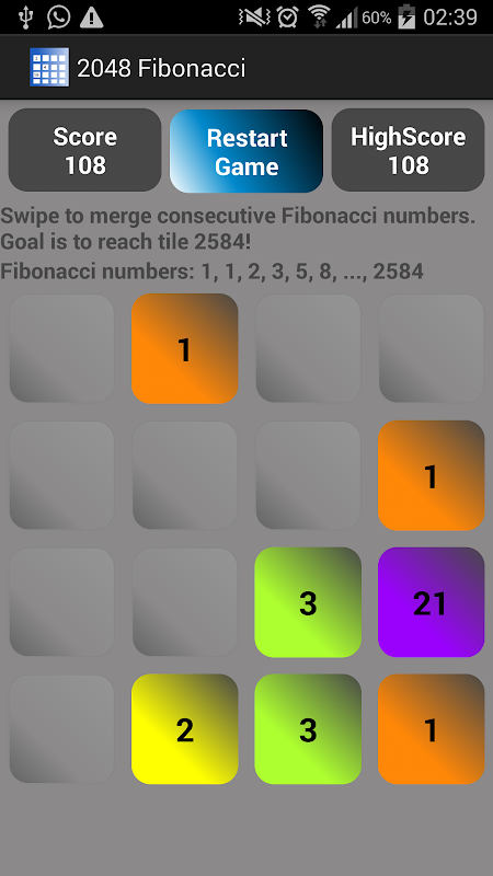 2048 Fibonacci . Maths Game. Play 2048 Fibonacci to get to goal of tile 2584
