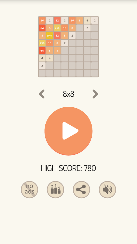In 2048 Plus Puzzle you can play different board sizes including smallest 3x3 and biggest 8x8 board sizes.