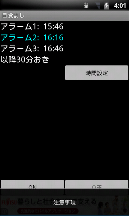 ・設定するのは1つの時間のみです。例えば朝6時に設定した場合、まず5時30分に警告として1回、その後実際に起きる為に6時に1回、その後もし寝過ごした場合を考え30分おきに(アプリを起動してOFFにしない限り)鳴り続けます。