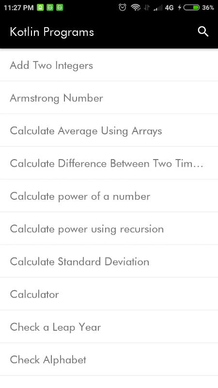 This 300+ Kotlin Programs will help you to learn Kotlin programming language by simple example. This Kotlin Programs App is very useful for all type of learners. We designed this Kotlin Programs App in a plain simple way in order that it is easily understandable by everyone.