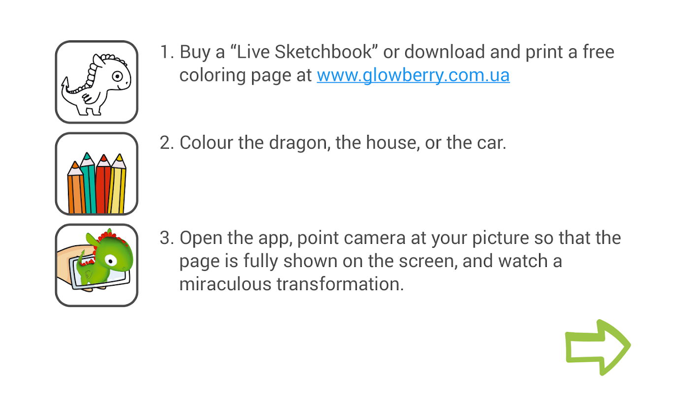 For the magical transformation, get a Live Sketchbook, which you can buy here: http://glowberry.com.ua/ua/souvenirs/zhivoj-bloknot/p76, or download three free coloring pages here: http://glowberry.com.ua/ua/apps/3d-artist.