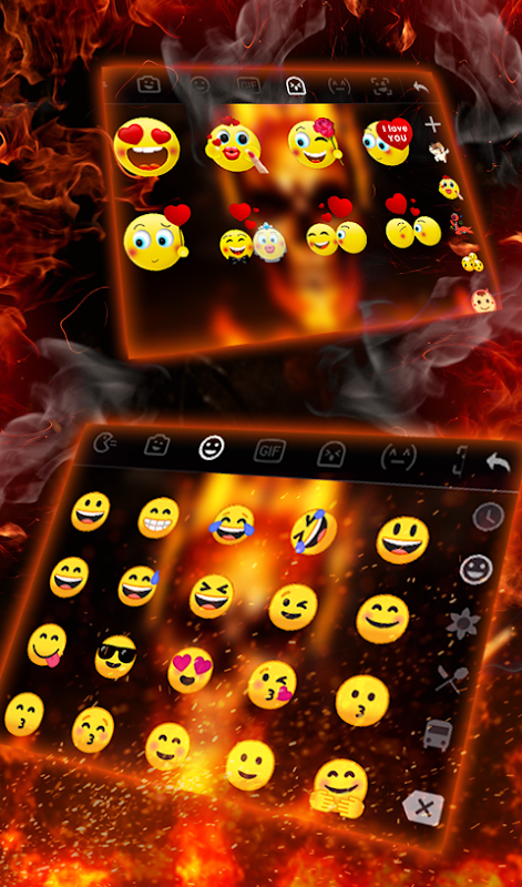 Apply 3D Fire Burning Skull Keyboard Theme and enjoy chatting with fun, cute, crazy emoji.