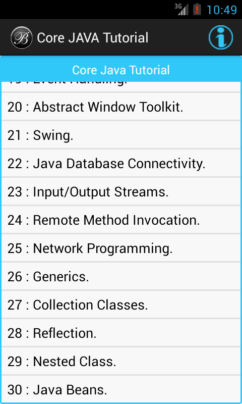 This Core JAVA Tutorial App will help you to learn JAVA programming language by simple example. This Core JAVA Tutorial App is very useful for all type of learners. We designed this Core JAVA Tutorial App in a plain simple way in order that it is easily understandable by everyone. This Core JAVA Tutorial App is good for beginners to learn basic JAVA programming by simple and suitable examples.