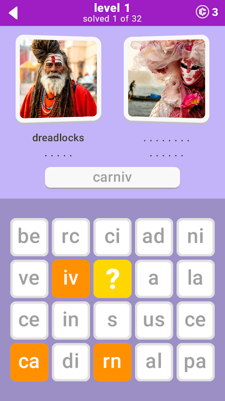 Two words per photo. 32 words per level. 640 words in the game. Can you find all of them? Sometimes you have to think beyond the obvious. Good luck!