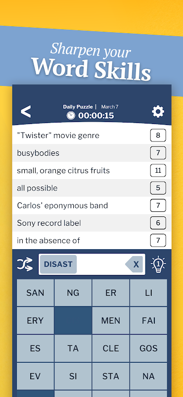ใช้คำใบ้และบล็อกตัวอักษรเพื่อค้นหาคำที่มีสัญญาณรบกวนในปริศนาขนาดพอดีคำแต่ละคำ