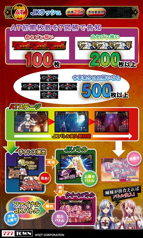 純増2.8枚のAT「JKラッシュ」を搭載し、5号機の高純増AT機では最高クラスの初当たり確率「1/296(設定1)」を実現!最高クラスの「純増スピード×初当たり確率」が生み出す、圧倒的な期待と興奮が味わえる究極バランススペックの誕生!
