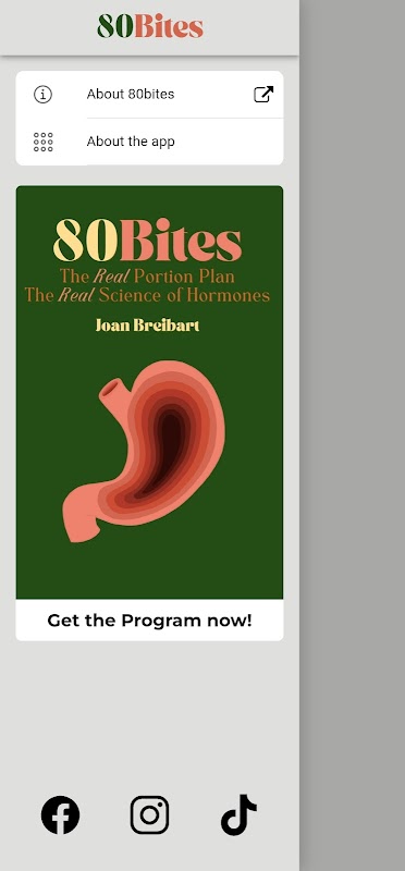 สร้างโดยนักโภชนาการที่ลงทะเบียน Meredith Luce RD MS LN และผู้เชี่ยวชาญด้านพิลาทิส Joan Breibart แอพ 80Bites นำหน้าโปรแกรม 80Bites - 12 STEPS ที่พัฒนาขึ้นเพื่อลดความหิว - เช่นเดียวกับ Ozempic! การลดน้ำหนักจะเกิดขึ้นโดยอัตโนมัติเมื่อคุณควบคุมความหิว เยี่ยมชม 80Bites.com เพื่อสมัครรับโปรแกรม 12 STEP Stomach Training และทิ้งการอดอาหารให้ดี!