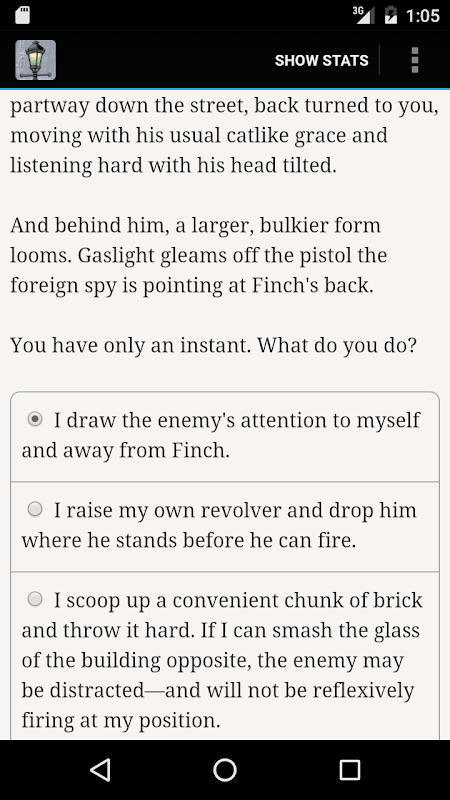 หุ่นยนต์พลังไอน้ำพบกับเวทมนตร์ต้องห้าม! "A Study in Steampunk: Choice by Gaslight" เป็นนวนิยายลึกลับเชิงโต้ตอบความยาว 277,000 คำที่เขียนโดย Heather Albano ผู้ร่วมเขียน "Choice of Broadsides," "Choice of Zombies" และ "Choice of Romance: Affairs of the Court" ทางเลือกของคุณกำหนดเรื่องราว เรื่องราวทั้งหมดเป็นแบบข้อความโดยไม่มีกราฟิกหรือเอฟเฟกต์เสียง และขับเคลื่อนด้วยพลังจินตนาการอันกว้างใหญ่ที่ไม่อาจหยุดยั้งของคุณ