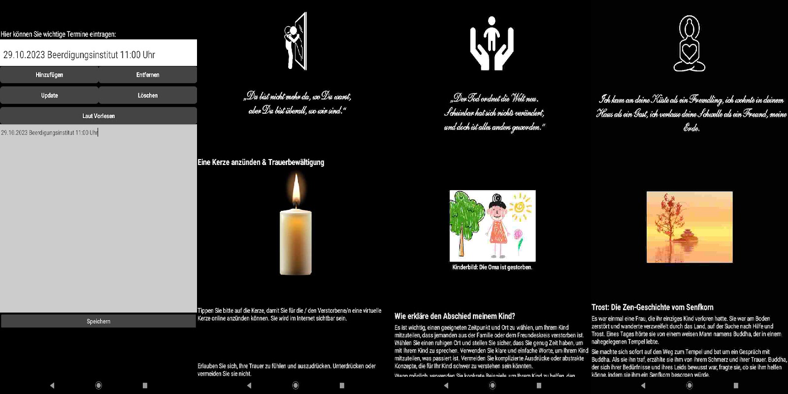 แอพนี้นำเสนอโซลูชั่นที่สมบูรณ์สำหรับงานทั้งหมดที่เกี่ยวข้องกับการสูญเสีย คำพูดไว้ทุกข์และเทวดาเศร้าโศกเพื่อปลอบใจ