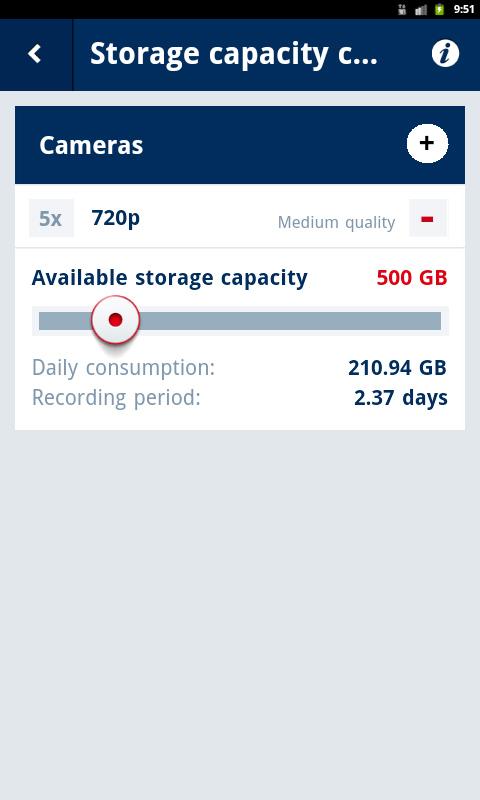 In order to start calculating the storage capacity requirements just select a camera resolution (analogue, 720p or 1080p), choose the quality setting for recording and determine the available storage.