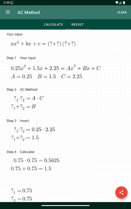 สำหรับการแยกตัวประกอบกำลังสอง app นี้ใช้วิธี AC สำหรับสิ่งนี้ต้องป้อนตัวแปรสามตัวเท่านั้น วิธีแก้ปัญหาจะแสดงทีละขั้นตอน การคำนวณทั้งหมดจะถูกเก็บไว้ในประวัติ ทางออกสุดท้ายสามารถแบ่งปันได้