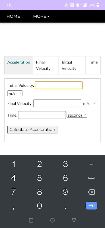 เมื่อคุณมีค่าเหล่านี้แล้ว คุณสามารถแทรกค่าเหล่านี้ลงในกล่องข้อความแล้วแตะปุ่มคำนวณ คุณสามารถแทรกความเร็วเริ่มต้นและความเร็วสุดท้ายได้ในหน่วย m/s, ft/s, mph, cm/s และ km/h