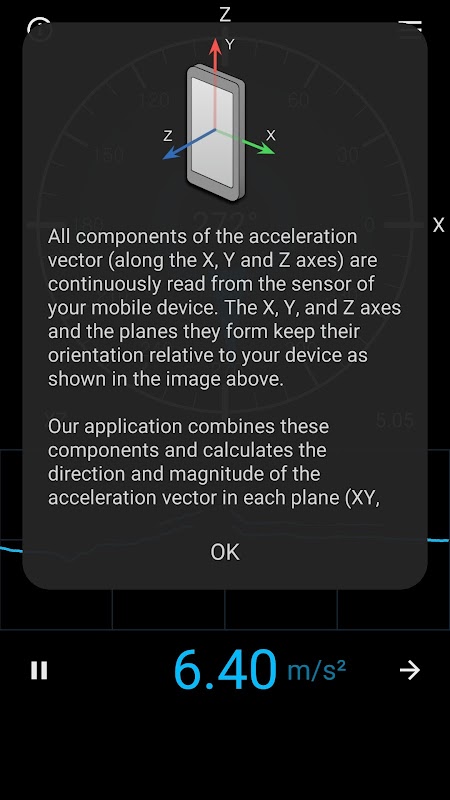 แอปนี้แสดงส่วนประกอบของเวกเตอร์ความเร่ง ทั้งขนาดและทิศทางในระนาบทั้งหมด ส่วนประกอบหลักของเวกเตอร์ความเร่ง (ตามแกน X, Y และ Z) จะถูกอ่านอย่างต่อเนื่องจากเซ็นเซอร์ของอุปกรณ์มือถือของคุณ แกน X, Y และ Z และระนาบที่แกนเหล่านั้นสร้างขึ้นจะรักษาทิศทางให้สัมพันธ์กับอุปกรณ์ของคุณ แอปพลิเคชันของเราใช้อัลกอริธึมที่รวดเร็วในการรวมส่วนประกอบเหล่านี้และคำนวณ ทิศทาง และ ขนาด ของเวกเตอร์ความเร่งในแต่ละระนาบ (XY, XZ และ ZY) ตัวอย่างเช่น หากคุณถือโทรศัพท์ตั้งตรง เวกเตอร์ความเร่งโน้มถ่วงในระนาบ XY จะมีความเอียง 270 องศา และขนาด 9.81 m/s2