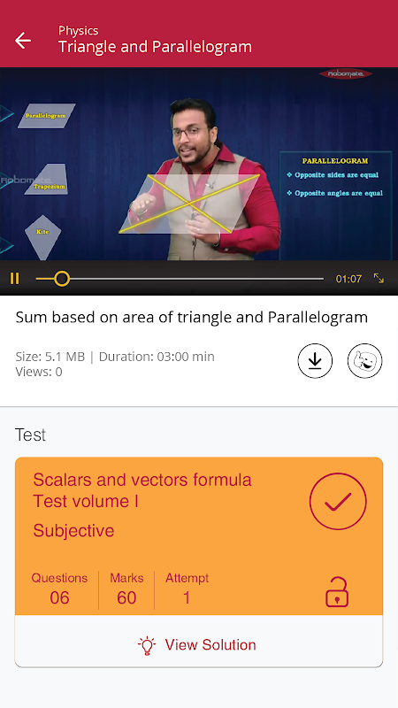 With the launch of this learning App, Achariya World Class Education, Mumbai are poised to enter a new era of technology enabled learning. The App is available exclusively to the students and teachers of Achariya World Class Education, Mumbai. Through this Learning App, you can access video lectures by expert teachers and take tests/assessments after watching the video lecture and/or after completing a chapter, whenever you want. These video lectures will help you in understanding concepts and solving question papers. Since the complete course videos are available with you 24/7 you can study and revise anytime throughout the year. The content is well organized by chapters and simply structured for easy navigation. Each chapter is broken into small modules of 5 to 7 mins each to keep the lectures interesting and to the point. The relevant topic is explained thoroughly. Animation and presentation have been included so that you can understand concepts better. You can even add notes to the video timeline and assess your performance with tests at the end of every chapter (EoC) and module (EoM).