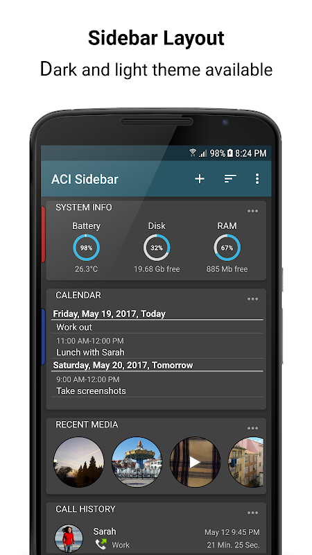 เพิ่มวิดเจ็ตขนาดเล็กไปจนถึงแถบด้านข้างและมีพวกเขาเสมอ มีเครื่องมือที่แตกต่างแสดงข้อมูลที่แตกต่างกันเช่น วาระปฏิทิน, บันทึกการโทร, ภาพถ่ายและภาพและอื่น ๆ ปรับแต่งแถบด้านข้างข้อมูลให้เป็นไปตามความต้องการของคุณ