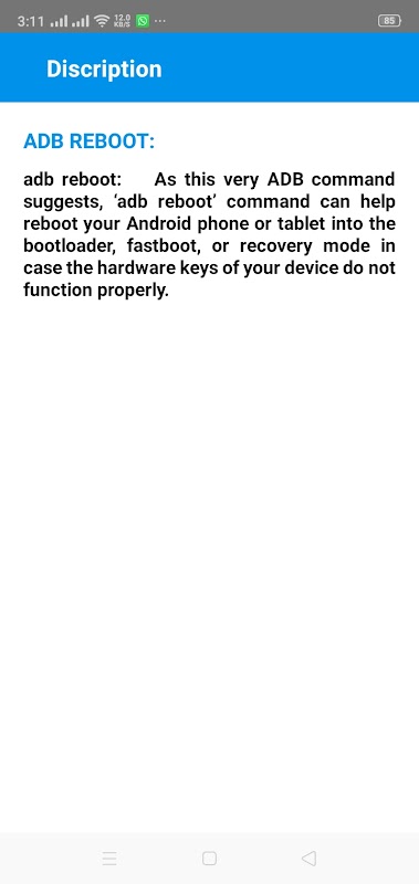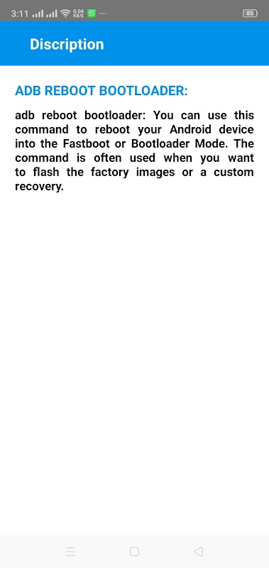 คำสั่ง Fastboot ยังมีประโยชน์เมื่ออุปกรณ์ของคุณอยู่ในโหมด fastboot หรือในโหมด bootloader รายการคำสั่ง fastboot มีประโยชน์สำหรับการแฟลชไฟล์รูปภาพใหม่หรือ ROM แบบกำหนดเองบนอุปกรณ์ Android รายการคำสั่งโหมด Fastboot เป็นคำสั่งที่มีประสิทธิภาพมากซึ่งใช้ในการเขียนไฟล์รูปภาพบนอุปกรณ์ คำสั่งรีบูต fastboot ใช้เพื่อรีบูตอุปกรณ์จากโหมด fastboot เป็นโหมดการกู้คืน คำสั่งรีบูต fastboot จะรีบูตอุปกรณ์ Android ในรูปแบบปกติและใช้งานได้ คำสั่ง Fastboot OEM Unlock ใช้เพื่อปลดล็อคชั้นความปลอดภัยของ bootloader OEM ย่อมาจาก Original Equipment manufacturers คำสั่ง Fastboot OEM Unlock จะปลดล็อคข้อมูลผู้ผลิต รายการคำสั่ง fastboot ที่สมบูรณ์มีให้ในแอปนี้เพื่อการเรียนรู้