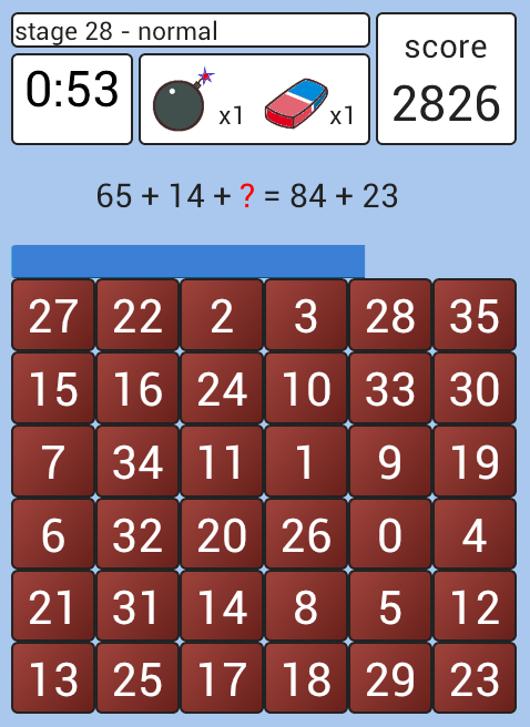 Find in the matrix the suitable number to complete the sum. In each stage, you have to find ten numbers (except in difficulty level "beginner", where you just have to find seven numbers) before time gets to zero. As you progress in the game, the size of the matrix and the number of sums increases.
