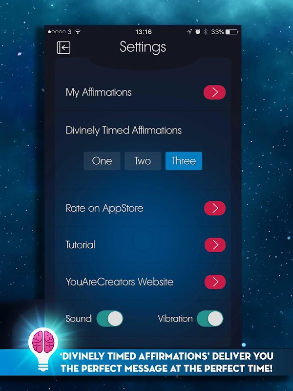 คุณสามารถเลือกที่จะตั้งเวลาแจ้งที่กำหนดเองเช่นเดียวกับ "พระเจ้าตั้งเวลาเตือน" ซึ่งสุ่มส่ง affirmations ของคุณกลับมาให้คุณในเวลาที่สมบูรณ์แบบใช้การสื่อสารสากลของพระเจ้า