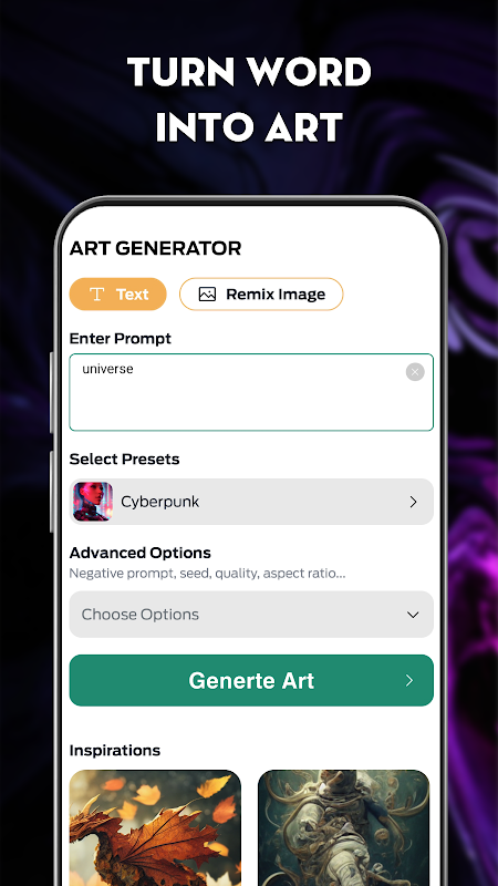 ปลดล็อกจินตนาการของคุณด้วยเครื่องสร้างงานศิลปะ AI ซึ่งออกแบบมาเพื่อเปลี่ยนข้อความใดๆ ให้เป็นงานศิลปะที่สวยงาม เพียงพิมพ์คำพูด ความทรงจำ หรือแนวคิดที่คุณชื่นชอบ แล้วดูในขณะที่เครื่องกำเนิดงานศิลปะ AI ประดิษฐ์คำพูดของคุณเป็นภาพที่น่าทึ่ง ด้วยเครื่องสร้างงานศิลปะ AI คุณสามารถสร้างโปสเตอร์ที่สวยงาม กราฟิกโซเชียลมีเดีย หรือของขวัญที่ปรับแต่งเองได้