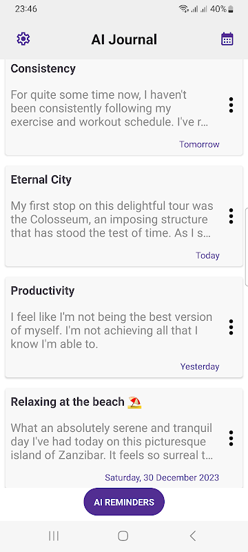 ไม่พลาดช่วงเวลาแห่งกำลังใจ! ผู้ช่วย AI ของเราจะวิเคราะห์รายการของคุณเพื่อส่งการแจ้งเตือนอย่างทันท่วงทีพร้อมระดับความสำคัญที่แตกต่างกัน ให้ภูมิปัญญาในบันทึกประจำวันของคุณนำทางคุณไปสู่สิ่งที่ดีกว่า