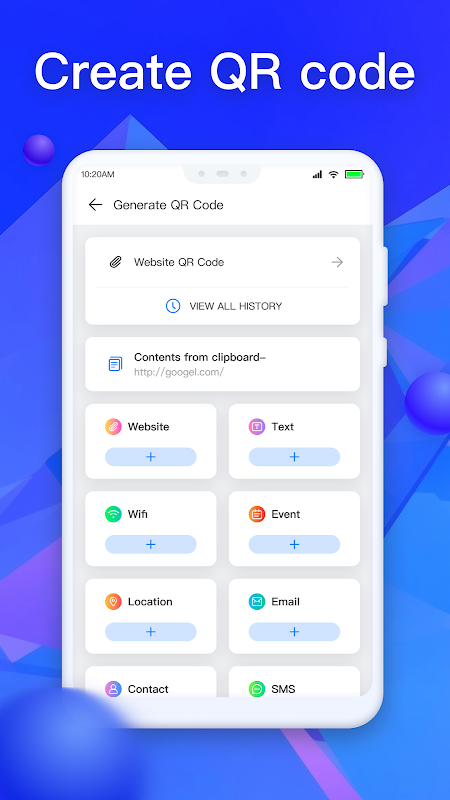 เครื่องสแกนรหัส QR แอพเครื่องอ่านบาร์โค้ดยังมีคุณสมบัติตัวสร้าง QR ช่วยให้คุณสร้างรหัส QR ของคุณเองด้วยประเภทต่าง ๆ ได้อย่างง่ายดาย
