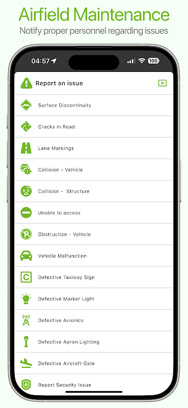 การรายงานปัญหา: บุคลากรทุกคนที่ได้รับอนุญาตในสนามบินสามารถใช้ Airside เพื่อรายงาน FOD และปัญหาด้านความปลอดภัยและการบำรุงรักษาอื่นๆ อีกมากมาย ผู้ใช้เพียงแค่ส่งปัญหาโดยพูดคุยกับ Airside AI และเลือกอัปโหลดรูปภาพ สิ่งนี้จะแจ้งเตือนแผนกที่เกี่ยวข้องทันทีให้แก้ไขปัญหา และตามที่ ATC จำเป็นต้องออก NOTAM ให้ปิดส่วนของสนามบินหรือปิดรันเวย์จนกว่าปัญหาจะได้รับการแก้ไข