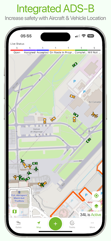 ตำแหน่งเครื่องบินและยานพาหนะของ ADS-B: เขตการบินช่วยให้ผู้ใช้ทุกคนสามารถดูตำแหน่งแบบเรียลไทม์ของเครื่องบินทุกลำบนภาคพื้นดิน รวมถึงยานพาหนะที่ติดตั้งเครื่องขนส่ง ADS-B รวมถึงตำแหน่งของบุคลากรในสนามบินที่ได้รับอนุญาตอื่นๆ ทั้งหมดแบบเรียลไทม์ เพียงแค่ติดตั้งแอป Airside ด้วยสมาร์ทโฟนของพวกเขา