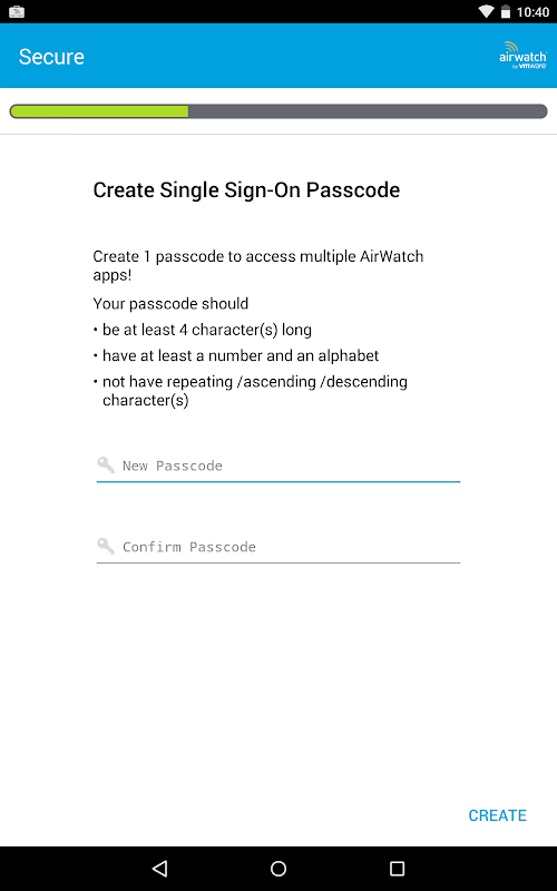 Step 2: Once AirWatch Container loads onto your device, enter your corporate credentials and set a passcode.