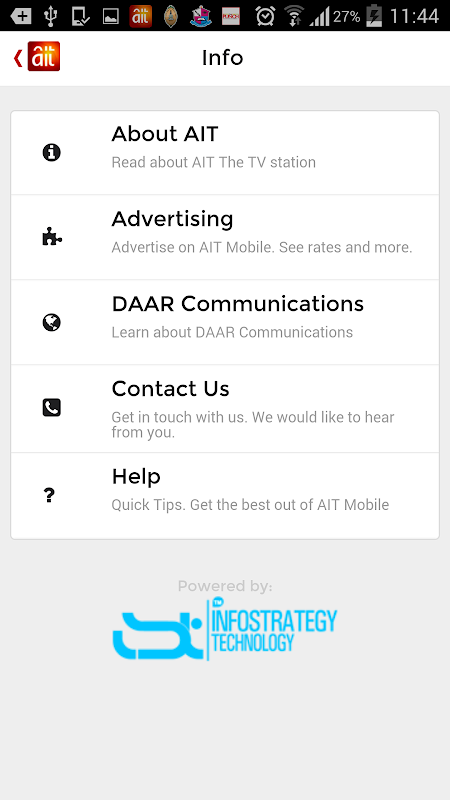 Its main features include recent News Updates, TV Programs and Schedule, Videos, Weather Update, AIT Information interfaces (About AIT, DAAR, and so on) and contact information sections.