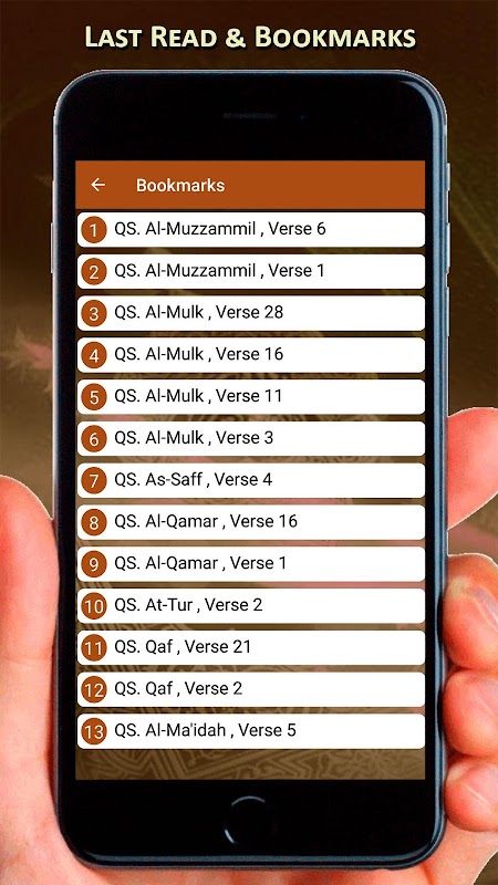 ● Surah List Includes: Surah Al-Fatihah, Al-Baqarah, Yusuf, Ibrahim, Al-Kahf, Maryam, Al-Hajj, Al-Furqan, Surah Yasin (Surah Yaseen), Muhammad, Surah Rahman Audio (Ar-Rahman), Surah Mulk Audio (Al-Mulk), Surah Muzammil (Al-Muzzammil), Surah Waqia etc.