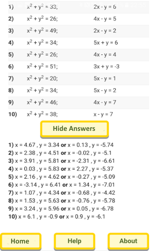 แอปพลิเคสมปั่นไฟ, สามารถสร้างชุดของคำถามที่มีคำตอบ - ที่สุ่ม มันเป็น app ขรึมซึ่งก็คือการใช้งานง่ายและธรรมดาและเรียบง่าย; สมการสามารถเป็นเชิงเส้นพร้อมกันหรือกำลังสองพร้อมกัน-กำลังสอง คุณสามารถสร้างจำนวนของชุดคำถามกับ app นี้ใด ๆ ซ้ำเป็นไปได้; พวกเขา แต่จะถูกเก็บไว้ให้น้อยที่สุดด้วยความช่วยเหลือของอัลกอริทึมพิเศษ