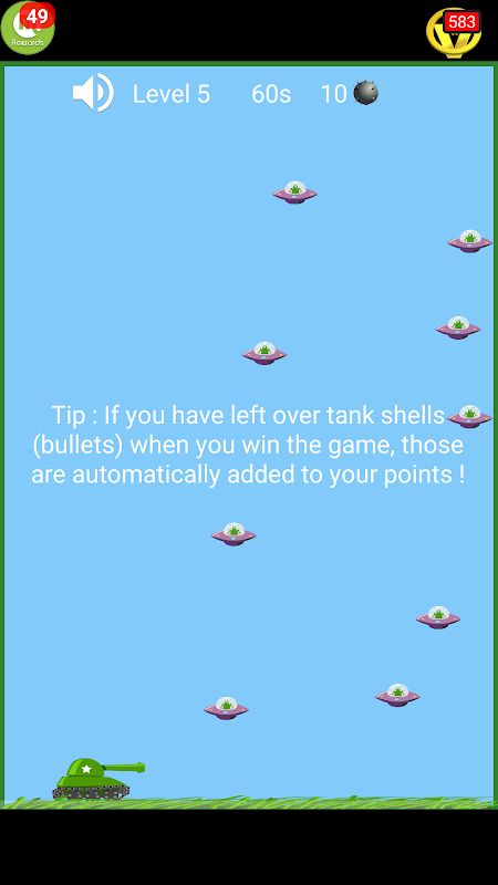 The skies of planet earth are dark with the alien spaceships hovering over and their intentions don't look benign. All of earth's defenses have been overrun. You are the ONLY hero left and the LAST defense. The good news is that all the other heroes did massive damage to the aliens and there are only a limited number of alien spaceships left. Your goal is to eliminate all the remaining spaceships and bring glorious victory to planet Earth !