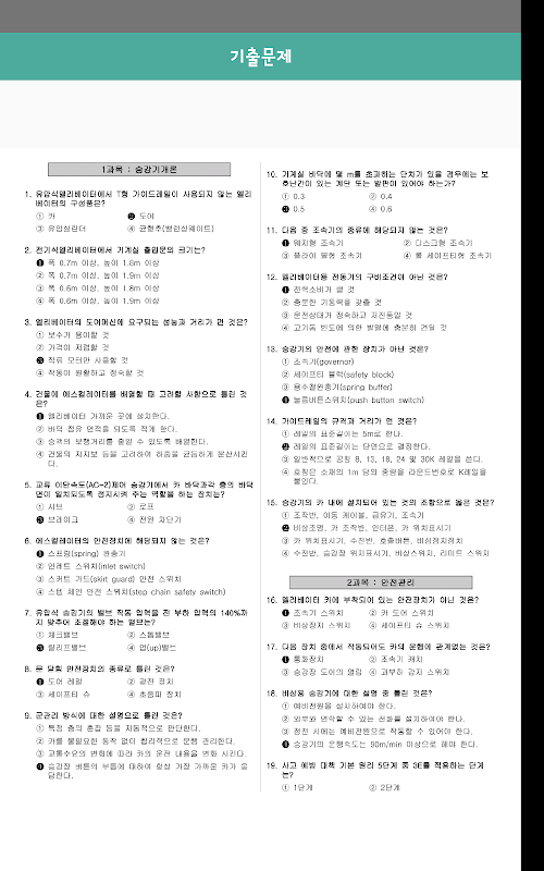 승강기기능사 기출문제를 다루고 있으며, 정답을 함께 표현하여 공부하는 시간을 절약 할 수 있습니다.