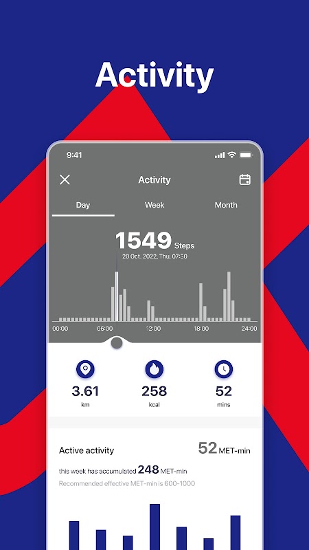 - กราฟรายละเอียดจำนวนก้าว การนอนหลับ อัตราการเต้นของหัวใจสำหรับวัน สัปดาห์ และเดือน