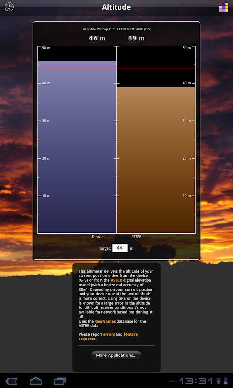 เครื่องวัดระยะสูงนี้ให้ความสูงของตำแหน่งปัจจุบันของคุณทั้งจากอุปกรณ์ (GPS) หรือจากรุ่น ASTER สูงดิจิตอล (มีความถูกต้องในแนวนอนของ 30m)