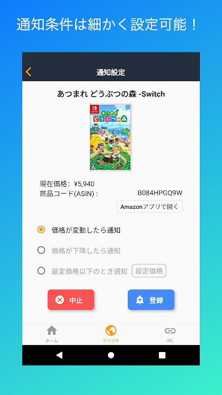 - 通知条件は「価格変動」・「価格降下」・「指定価格以下」から選択できます。