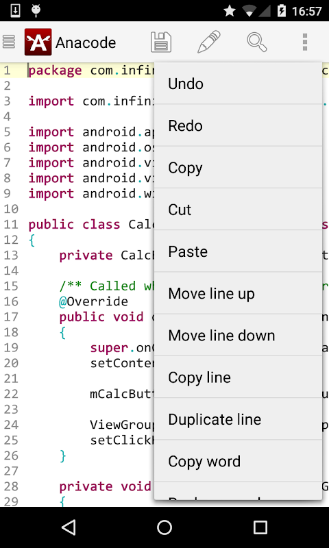 Anacode เป็นสภาพแวดล้อมการพัฒนาแบบบูรณาการและแก้ไขรหัสต้นฉบับสำหรับ Java, HTML, CSS, PHP, JavaScript และ C / C ++ ไฟล์ที่ช่วยให้คุณสร้างและเรียกใช้การใช้งาน Android โดยตรงบนอุปกรณ์ Anacode โดยตรงสามารถสร้างเอพีเคจากซอร์สโค้ดโครงการหุ่นยนต์ของคุณด้วยการคลิกเพียงครั้งเดียวใน "Run" รายการในเมนู เพียงแค่เปิด JAVA หรือ XML ไฟล์ใด ๆ ที่เป็นส่วนหนึ่งของโครงการของคุณ