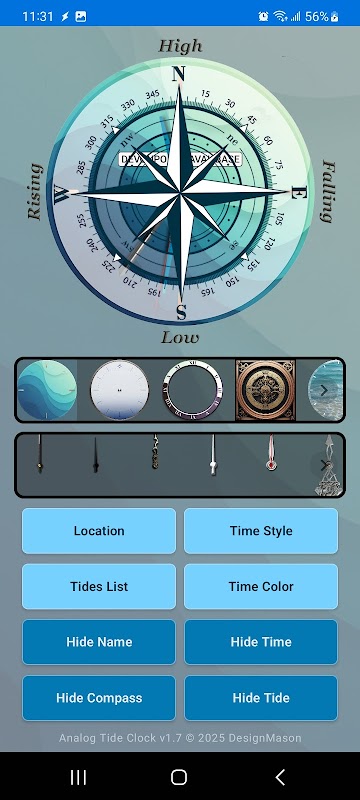 Analog Tide Clock is a customizable clock that displays tide position and current time, with optional compass plus 12 hour and 24 hour clock modes.