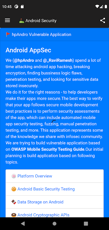 Android AppSec (Kotlin) app will help you to practice for Android Security points. We do it for the right reasons - to help developers make their apps more secure. The best way to verify that your app follows secure mobile development best practices is to perform security assessments of the app, which can include automated mobile app security testing, fuzzing, manual penetration testing, and more. This application represents some of the knowledge we share with the infosec community. We are trying to build a vulnerable application based on OWASP Mobile Security Testing Guide.