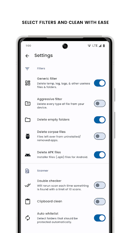 Он включает в себя множество других функций, которые помогут вам поддерживать чистоту и бесперебойную работу вашего телефон а, например очистку буфера обмена, диспетчер приложений, белый список и настраиваемые фильтры очистки. С помощью AndoidCleaner вы можете легко поддерживать свой телефон в отличном состоянии, не беспокоясь о сложных настройках или рутир. овании вашего устройства.