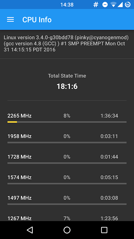 ข้อมูล CPU จากที่คุณสามารถเก็บตากับช่วงเวลาของการใช้ความถี่ของหน่วยประมวลผลแต่ละแสดงเคอร์เนลทำงานและเวลาที่ผ่านไปนับตั้งแต่บูตล่าสุด
