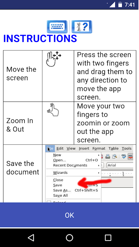 คุณสามารถดูคู่มือเกี่ยวกับการใช้แอปนี้ได้ที่ http://www.offidocs.com แต่โปรดทราบว่าแอพพลิเคชัน AndroWriter มีคำแนะนำในการแก้ไขเอกสาร มีหลายปุ่มสำหรับการดำเนินงาน: