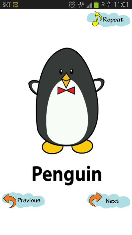 아이콘을 누르면 동물 카드가 뜨며 각 동물의 영어 단어와 영어 발음을 배울 수 있습니다.