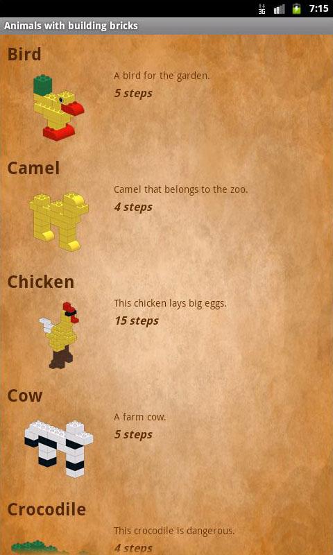 Create animals with simple step-by-step instructions. Playing is fun and will add a lot the development of motoric skills. This puzzle game is really for all ages. Bring the bricks together and follow the color pattern. Have fun creating a cow, giraffe, snake, camel, elephant, duck and many more.