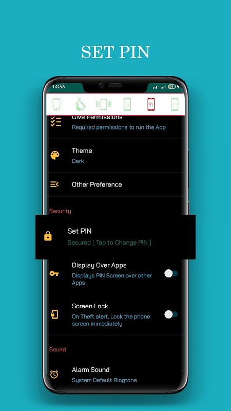 •ตั้งค่า PIN ของคุณก่อน ไปที่หน้าจอการตั้งค่าการเตือนความปลอดภัยป้องกันการโจรกรรมและเลือกตั้งค่า PIN
